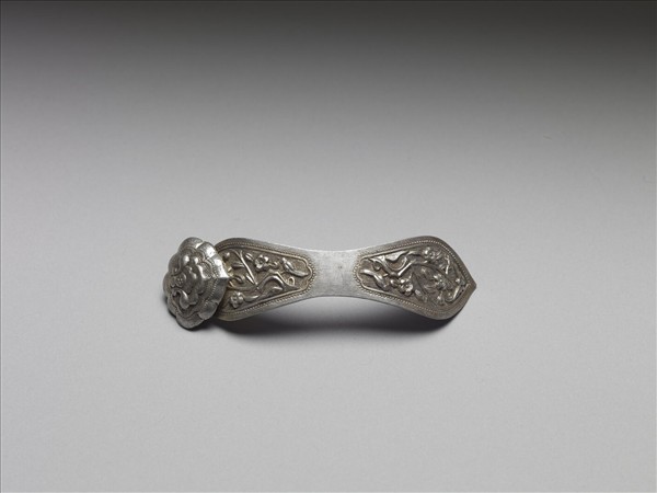 扁簪,銀銅合金,長形,中央較細,兩側鈍圓而尖首。正面兩側開光中飾圓點紋錦地敲花喜鵲、折枝梅花紋,有「喜上眉梢」之意,一端加飾一片如意首朵花紋銀片。