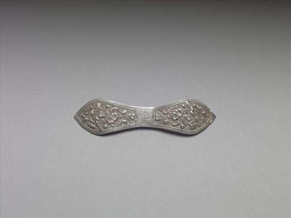 扁簪,銀銅合金,長形,中央較細,兩側鈍圓而尖首。正面兩側開光中飾魚子紋錦地敲花喜鵲、折枝梅花紋,有「喜上眉梢」之意,並於開光外緣飾一周連珠紋。中腰處光素無紋。此器紋飾風格素雅細膩。