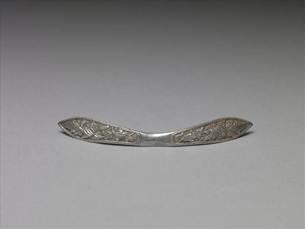 扁簪,銀銅合金,整體細長,中央較細,兩側鈍圓而尖首。正面兩側開光中飾魚子紋錦地敲花花卉與葉紋,開光外緣飾一周圓形紋。中腰處正面光素無紋。扁簪背面兩端開光各帶兩長方框,內有陽文款「久祥」二字。此器紋飾風格素雅細膩。