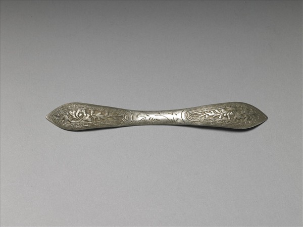 銀銅合金扁簪,整體細長,器身微彎,中腰稍細而兩端成尖角橢圓型,頂端各帶一尖角。正面以敲花技法於兩端開光外緣飾一周三角形紋與連珠紋,內部飾花葉紋。中腰處正面淺刻簡潔花葉紋,背面帶一長方框陽文印,文字模糊難辨。