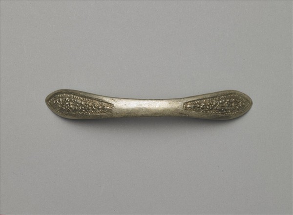 銀銅合金扁簪,整體細長,器身微彎。中腰稍細而兩端成尖角橢圓型。正面於兩端開光外緣飾一周不甚規則之連珠紋,內部飾花朵紋。中腰處正面光素紋。此器風格粗獷。