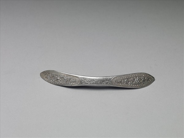 銀銅合金扁簪,整體細長,器身微彎,中腰稍細而兩端成尖角橢圓型。正面以敲花技法於兩端開光外緣飾一周連珠紋與三角形紋,內部飾喜鵲、折枝梅花紋,有「喜上眉梢」之意。中腰處淺刻簡潔花葉紋。