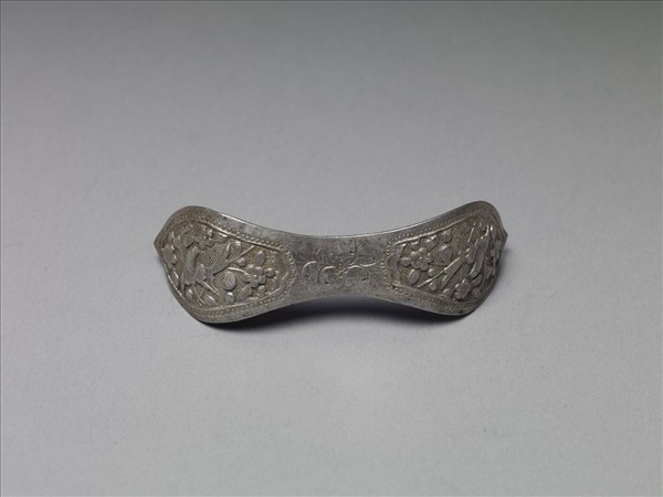 銀銅合金扁簪,器身微彎,中腰稍細而兩端成尖角橢圓型。正面以敲花技法於兩端開光外緣飾一周連珠紋,內部飾喜鵲、折枝梅花紋,有「喜上眉梢」之意。中腰處淺刻花葉紋。