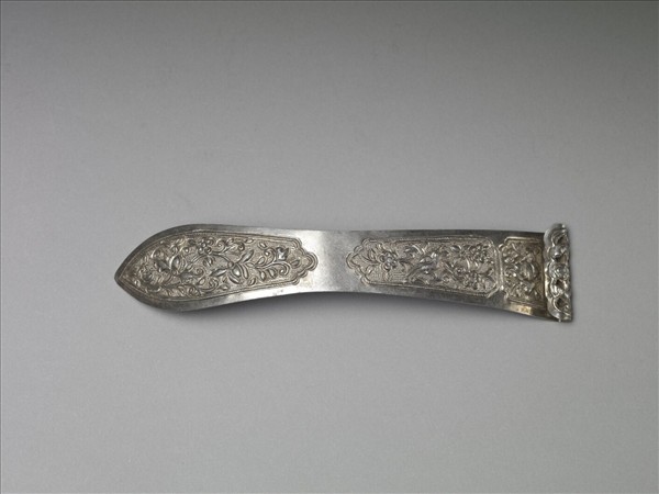 銀銅合金扁方,整體細長,器身微彎。中腰稍細,兩端漸寬。一端帶一尖角,另一端捲起。扁方正面於兩端開光外緣飾一周繩紋,內部飾捲曲翻轉之數朵盛放花紋與葉紋。並有回首鳥禽立於樹梢。以淺粟米銀珠為地紋。中腰處光素無紋。