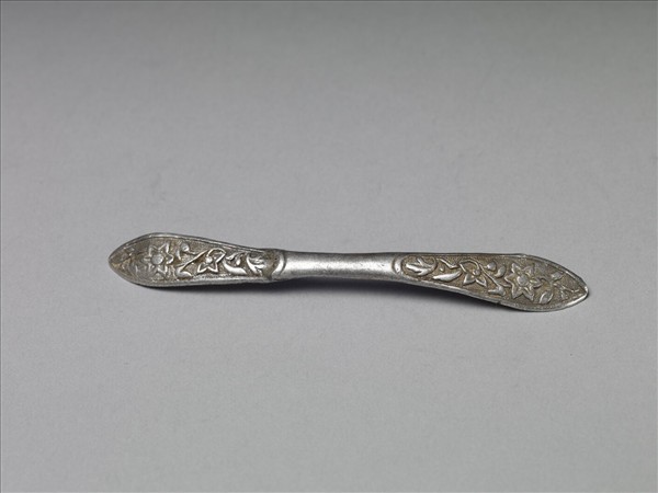 銀銅合金扁簪,整體細長,器身微彎。中腰稍細而兩端成尖角橢圓型。正面於兩端開光內部飾水仙花與葉,以淺粟米銀珠為地紋。中腰處光素無紋。