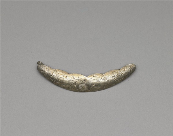 銀銅合金髮飾,整體呈月牙形,內緣帶六凹槽。器表微突,正面淺刻捲曲翻轉之花葉紋。器背光素,帶夾子以供固定髮飾。此器紋飾風格細膩流暢。