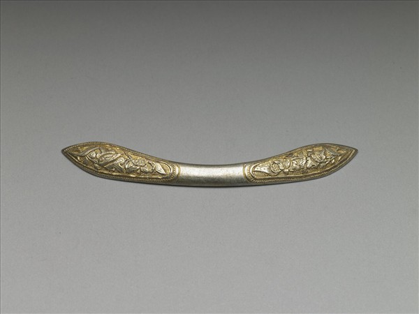 銀銅合金扁簪,整體細長,器身微彎。中腰稍細而兩端成尖角橢圓型。正面於兩端開光外緣飾一周連珠紋,內部飾花葉紋,並以淺粟米銀珠為地紋。中腰處光素無紋。