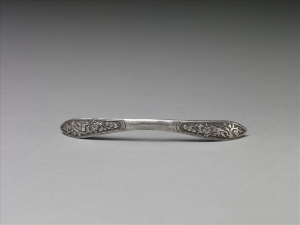 銀銅合金扁簪,整體細長,器身微彎。中腰稍細而兩端成尖角橢圓型。正面於兩端開光外緣飾一周連珠紋,內部飾喜鵲、折枝梅花紋,有「喜上眉梢」之意。底部以淺粟米銀珠為地紋。中腰處光素無紋。背面兩端各帶兩長方框「永和」陽文印。