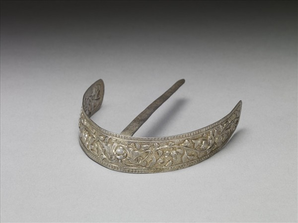 髮簪,銀銅合金,簪首微彎呈圓弧形的長形銀片,如弦月形。飾敲花卷枝花卉紋與蝙蝠,邊緣有棱,扁平簪挺接合於簪首背面中央。