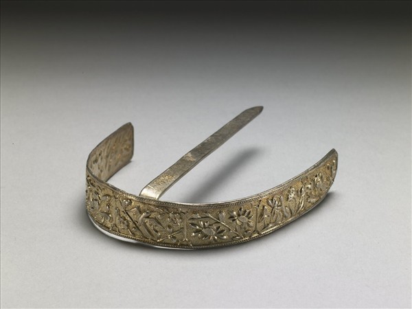 髮簪,銀銅合金,簪首微彎呈圓弧形的長形銀片,如弦月形。畫面分成五個海棠形開光,飾敲花蓮塘、折枝菊花、喜上眉梢等紋飾,後襯圓點紋錦地,邊緣飾敲花連珠紋邊飾,扁平簪挺接合於簪首背面中央,簪頂上端有鏨刻款「王記」。