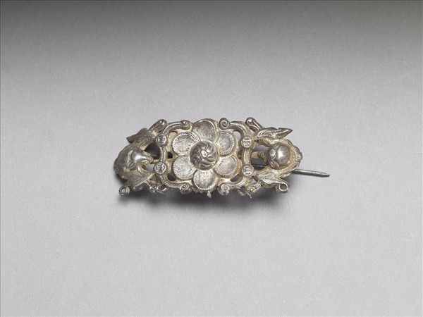 別針,銀銅合金,敲花為飾,中央為朵花紋,兩側有蝙蝠紋,雙翼前各有二銅錢紋,有「全福」之意;背面以銀絲作針。