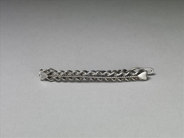 髮夾,銀銅合金,以三條粗細不等、呈絞絲狀的銀線組合而成,中央細銀線背面有齒,背面麻花形銀絲穿過圈環,可與環形扣扣合,以夾固定頭髮。