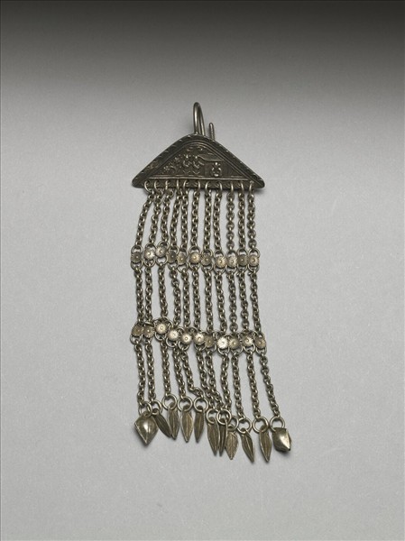 銀銅合金耳飾,環部為三角形金屬片,頂端帶一彎鉤。墜部綴十一條銀鍊流蘇,其上、中段各加入菊花形銀片,底端連接葉形墜角,惟兩旁流蘇底端接桃形墜角。各條細鍊則由中段之菊花形銀片處橫串起來。三角形金屬片邊緣飾半圓形紋,中間飾三人物,一人居屋中而二人佇立屋外。