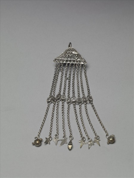 銀銅合金耳飾,環部為三角形金屬片,頂端帶一彎鉤。墜部垂九條細鍊,其中段各加入菊花形金屬片,底端連接三裂形葉形墜角,惟正中細鍊接一四角椎飾,兩旁細鍊端接球形墜角。各流蘇則由中段之菊花形金屬片處橫串起來。三角形金屬片邊緣飾半圓形紋,中間飾三人物,一人居屋中而二人佇立屋外。