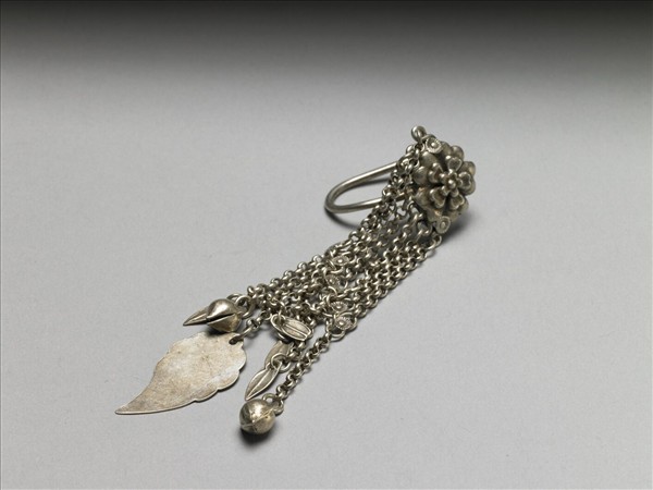 銀銅合金耳飾,環部為重瓣花形銀片,左右各飾一菊花,背面接一彎鉤。墜部垂七條銀鍊流蘇,其中段各加入菊花形銀片,底端連接小葉形墜角,惟正中流蘇接大形葉片,兩旁流蘇接桃形墜角。各流蘇則由中段之菊花形銀片處橫串起來。