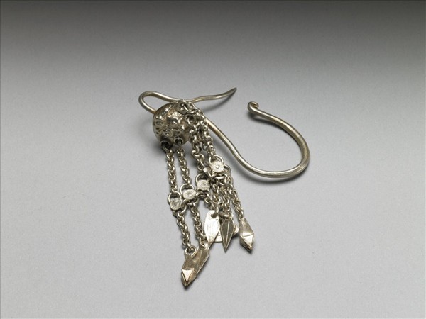 銀銅合金耳飾,環部為紋飾突起之銀片,背面接一朝下彎鉤,底端另有一鉤朝上彎曲。墜部垂六條銀鍊流蘇。其中段各加入菊花形銀片,底端連接葉形墜角,惟兩旁流蘇底端接四角椎形墜角。各流蘇則由中段之菊花形銀片處橫串起來。