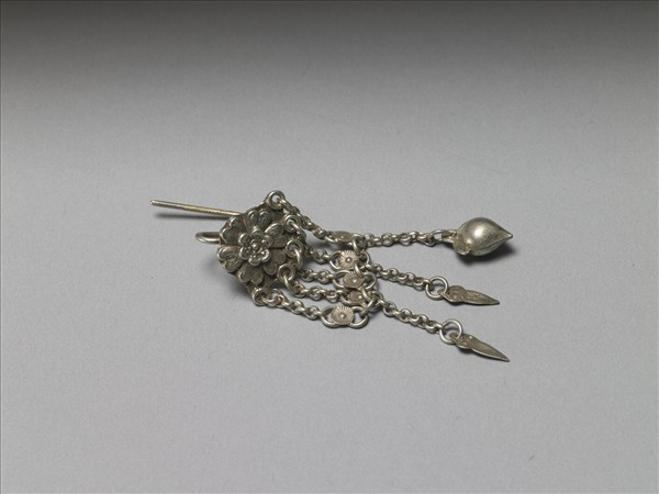 銀銅合金耳飾,環部為重瓣花形銀片,背面接一彎鉤。墜部垂五條銀鍊流蘇,其中段各加入菊花形銀片,底端減為三條流蘇,其中一條連接桃形墜角,其餘兩條連接葉片形墜角。