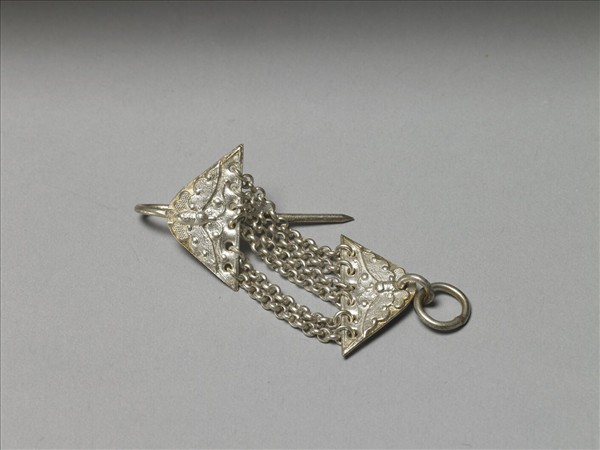 銀銅合金耳飾,環部為三角形銀片,背面接一彎鉤。墜部垂六條銀鍊流蘇,流蘇末端另接一倒三角形銀片,銀片底端接一大一小圓環。兩三角銀片表面各飾一展翼蝴蝶。