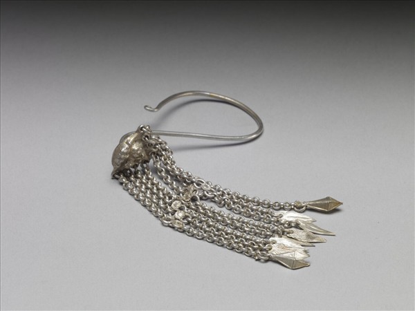 銀銅合金耳飾,環部為鼓起之不規則三角形銀片,背面接一彎鉤。墜部垂八條銀鍊流蘇,其中段各加入菊花形銀片,兩旁流蘇底端接四角錐形墜角,其餘流蘇末端另接葉形墜角。葉片之葉脈紋絡清晰可見。各流蘇則由中段之銀片處橫串起來。