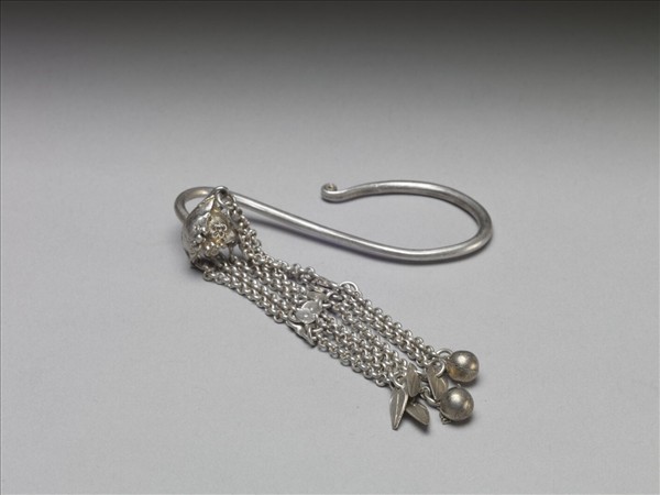 銀銅合金耳飾,環部為鼓起之不規則形銀片,背面接一彎鉤。銀片表面飾各式朵花。墜部垂六條銀鍊流蘇,其中段各加入菊花形銀片,兩旁流蘇底端接球形墜角,其餘流蘇末端另接葉形墜角。各流蘇則由中段之銀片處橫串起來。