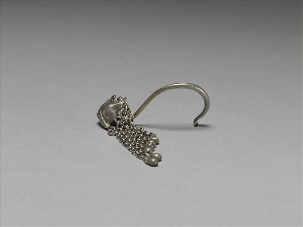 銀銅合金耳飾,環部為鼓起不規則形銀片,背後帶一彎鉤。墜部綴六條銀鍊流蘇,底端接圓形墜角,惟一旁流蘇底端墜角皆已失。