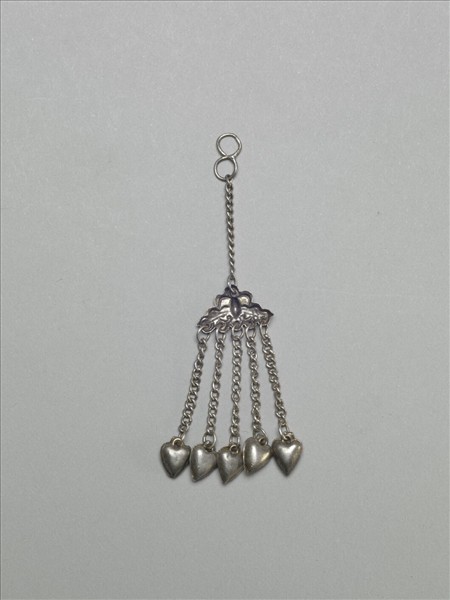 銀銅合金耳飾,環部為一蝴蝶形銀片,上端以銀鍊接兩相連圓環。墜部綴五條銀鍊流蘇,底端連接心形墜角。