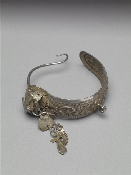 銀銅合金之穿孔式耳環,環面作一盛放重瓣花朵形狀,花心嵌一銀珠。花朵旁綴一六角形銀片,接兩不規則形墜角。全器下半部作半環形,表面飾滿表面飾滿捲曲翻轉之花卉與葉紋,中間花心處帶一立環。