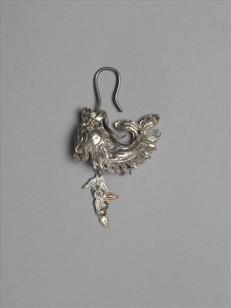 銀銅合金耳飾,環面為一龍首形,龍口接彎鉤。龍鬚與眉皆飄逸生動,龍首末端另接數片葉形墜角。下半部為一曲身魚形,背部帶突出棘,末端尾鰭分叉,並嵌一銀珠。