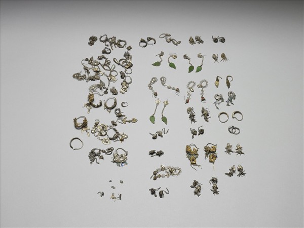 銀銅合金耳飾多件,並有各類造型,如葫蘆、花朵、金魚、葉片等。部分作品表面飾有琺瑯料。
