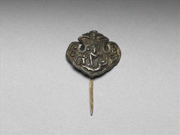 如意式髮簪,銀銅合金,如意雲形簪首,以敲花為飾,邊緣起棱,上方為蝠銜雙錢,中央有一壽星雙手持杖,左側坐一童子,右側一鶴相伴,兩旁飾折枝花卉,圖案隙地為圓點狀魚子紋錦地。扁平素挺,自簪首頂端回折,作如意狀。
