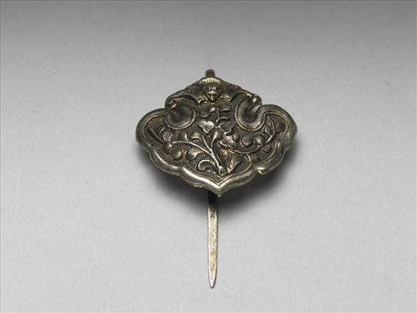 如意式髮簪,銀銅合金,如意雲形簪首,以敲花為飾,上方為蝠紋,中央捲葉折枝花卉,圖案隙地為圓點紋錦地,邊緣鏨刻線紋邊飾。半圓形素挺,自簪首頂端回折作如意狀,其上端與簪首相連處,有錘鍱而成的「和泰」陽文楷款。