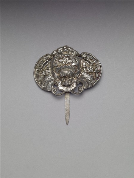 如意式髮簪,銀銅合金,橢圓形簪首,以敲花為飾,中央作蝙蝠形,上方飾六瓣花紋及蓮花,兩旁飾折枝梅花,圖案隙地為圓點紋錦地,邊緣鏨刻線紋邊飾。扁平素挺,自簪首頂端回折作如意狀。