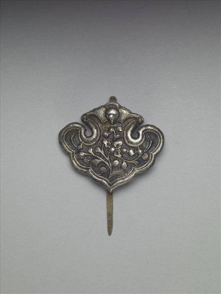 如意式髮簪,銀銅合金,如意雲形簪首,以敲花為飾,上方為蝠紋,中央捲葉折枝花卉,圖案隙地為圓點紋錦地,邊緣鏨刻線紋邊飾。扁平素挺,自簪首頂端回折作如意狀。