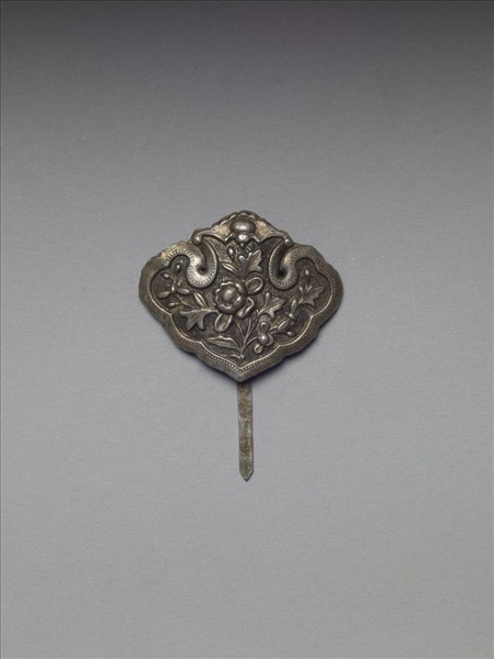 如意式髮簪,銀銅合金,如意雲形簪首,以敲花為飾,上方為蝠紋,中央捲葉折枝花卉,圖案隙地為圓點紋錦地,邊緣為連珠紋邊飾。扁平素挺,自簪首頂端回折,作如意狀。