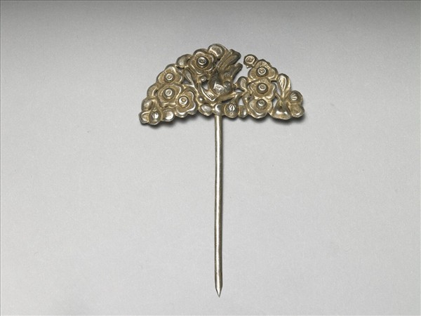 如意式髮簪,銀銅合金,半圓形簪首,以敲花作「喜上眉稍」圖樣,中央為喜鵲,周圍圍繞梅花及花苞,再以鏨刻作出花鳥果實上的細微線條。半圓形素挺,自簪首頂端回折,作如意狀,背面上端有「久和」陽文楷款。