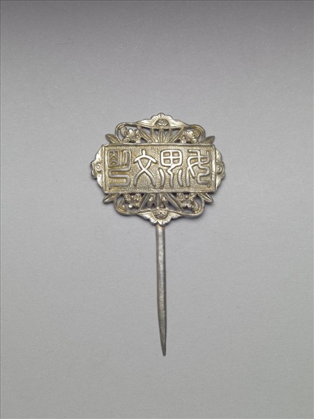 髮簪,銀銅合金,如意雲形簪首,以敲花為飾,中央有一長方形牌,中央有篆體陽文「世界文明」橫式四字,下襯圓點紋錦地,四邊外裝飾鏤空梅花竹葉紋。半圓形素挺。