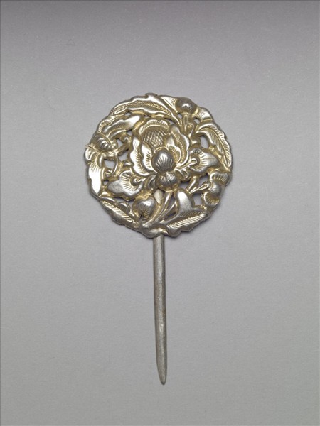髮簪,銀銅合金,圓形簪首,以鏤空敲花為飾,中央有一牡丹花,花朵周圍以枝葉圍繞,右上方有一蝴蝶。半圓形素挺。