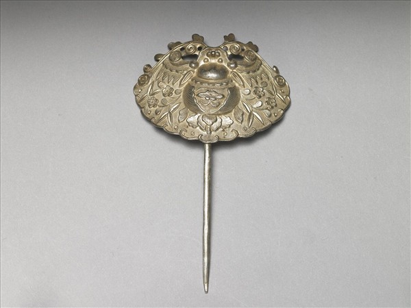 髮簪,銀銅合金,扇形簪首,以敲花為飾,中央為變形蝠紋,上方飾六瓣花紋及蓮花,兩旁飾折枝梅花,上端及兩側合計有四枚銅錢,有「喜福雙全」之意,圖案隙地為圓點紋錦地。半圓形素挺,背面有「王□」陰刻楷款。