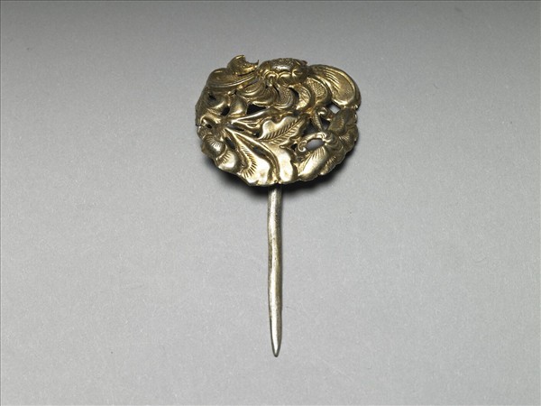 髮簪,銀銅合金,橢圓形簪首,以鏤空敲花為飾花蝶紋,花朵於上方,下方為枝葉,葉頂端有一蝴蝶;半圓素挺。
