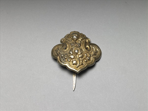 如意式髮簪,銀銅合金,如意雲形簪首,以敲花為飾,上方為蝠紋,中央捲葉折枝花卉,圖案隙地為圓點紋錦地,邊緣為連珠紋邊飾。扁平素挺,自簪首頂端回折,作如意狀,挺上有「聚成」陽文楷款。