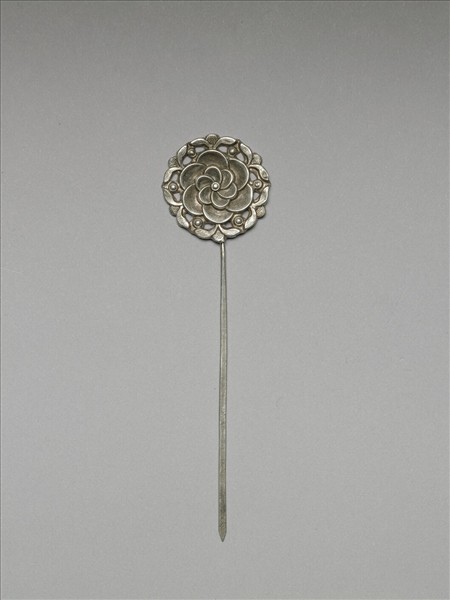 髮簪,以敲花銀銅合金片作花卉簪首,周圍圍繞鏤空小花葉紋裝飾,扁平素挺,上細下粗。