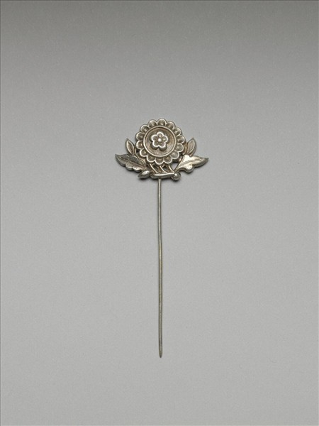 髮簪,以敲花銀銅合金片作折枝花簪首,中央為五瓣花,外有一圈突棱,外圈為十四瓣花,下襯枝葉。素圓挺。
