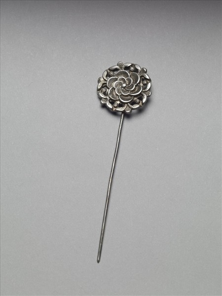 髮簪,以敲花銀銅合金片作花卉簪首,周圍圍繞鏤空小花葉紋裝飾,圓素挺。
