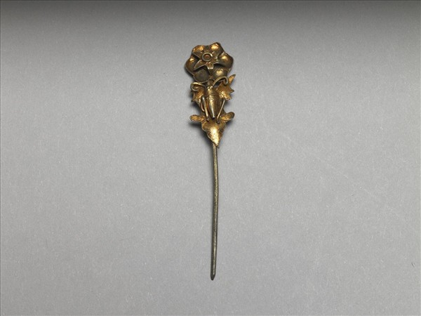 以敲花銀銅合金片作蝴蝶與六瓣花簪首,素圓挺。