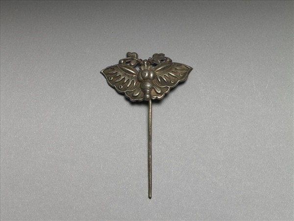 以敲花銀銅合金片作蝴蝶簪首,素圓挺。