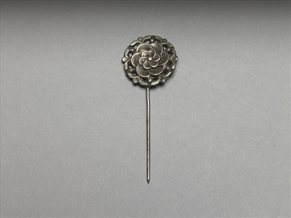以敲花銀銅合金片作花卉簪首,外圍環繞六組葉片紋裝飾,素圓挺。
