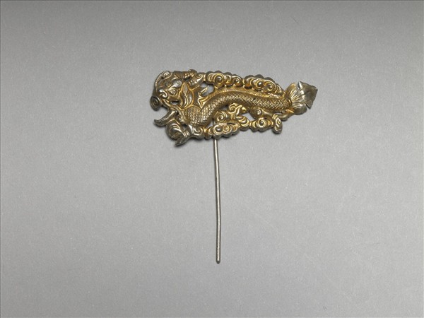 以敲花銀銅合金片作雲龍紋簪首,後方加銲一銀絲延伸至龍口前繞成圈環,如龍吐珠狀。素圓挺。