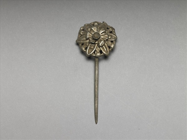 以敲花銀銅合金片作六瓣花簪首,由上下兩片銀花相疊而成,上層花中央有凹槽,可能有嵌件,已脫失;下層花瓣間連接有鏤空花紋裝飾,素圓挺。