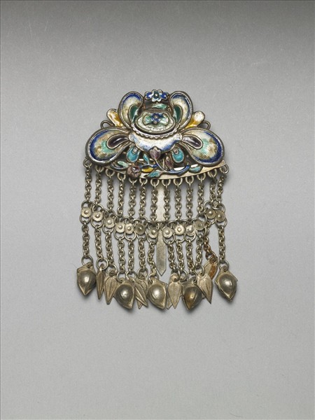 以敲花填料銀銅合金片作花朵紋簪首,下接十三條由菊花形片分隔成兩層的銀鍊流蘇,尾端串有葉形或桃形墜角。素長方片狀短鋌。
