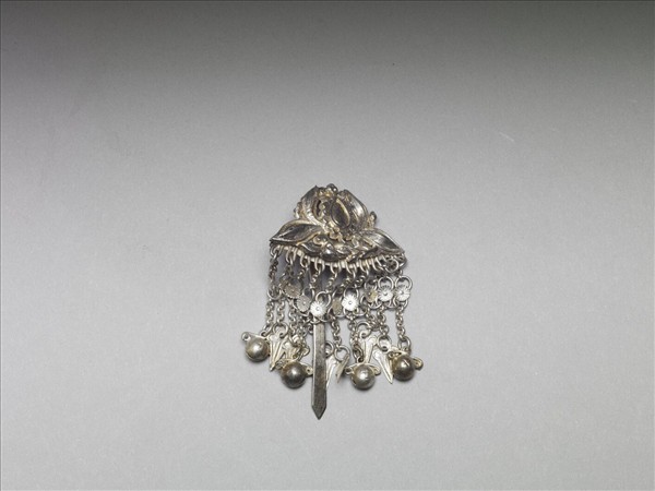 以敲花銀銅合金片作番蓮紋簪首,下接十條由菊花形片分隔成兩層的銀鍊流蘇,尾端串有葉形或鈴鐺墜角。素長方片狀短鋌。